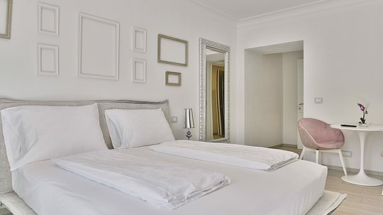 Lodging like the emperors? In our Deluxe Apartment you can! Elegantly refined and luxuriously designed, the apartment can accommodate up to 6 people in its three luxurious double bedrooms with King Size mattresses. Lines and design play on the soft tones of white and pink to bring out the light of the rooms and the elegant sophistication of the furnishings. In the fully equipped kitchen you can bring your culinary skills to bear and finally enjoy a real Italian coffee with the Nespresso coffee machine.