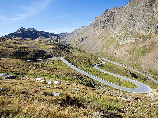 Bright sunshine, wide meadows, dark forests, and imposing peaks; in between all of that, a narrow, twisting pass road that winds its way upwards.
